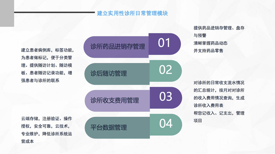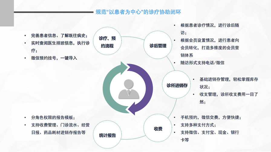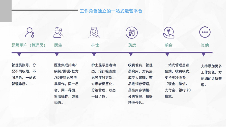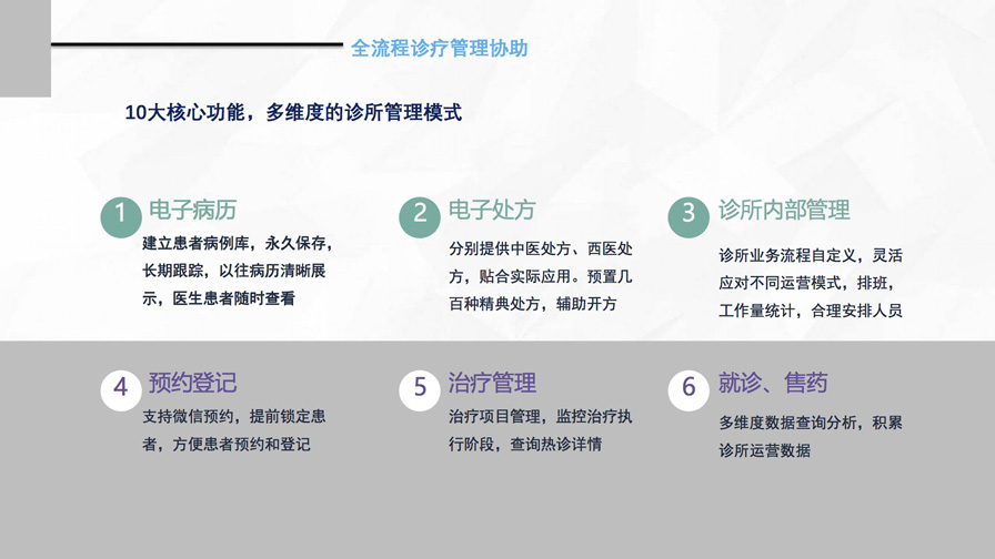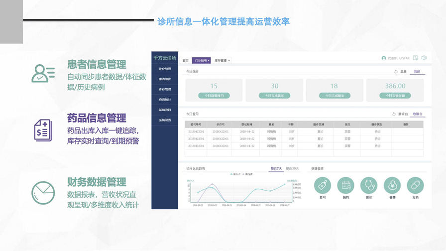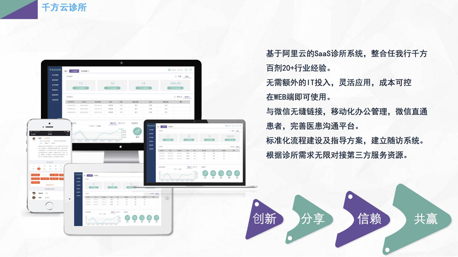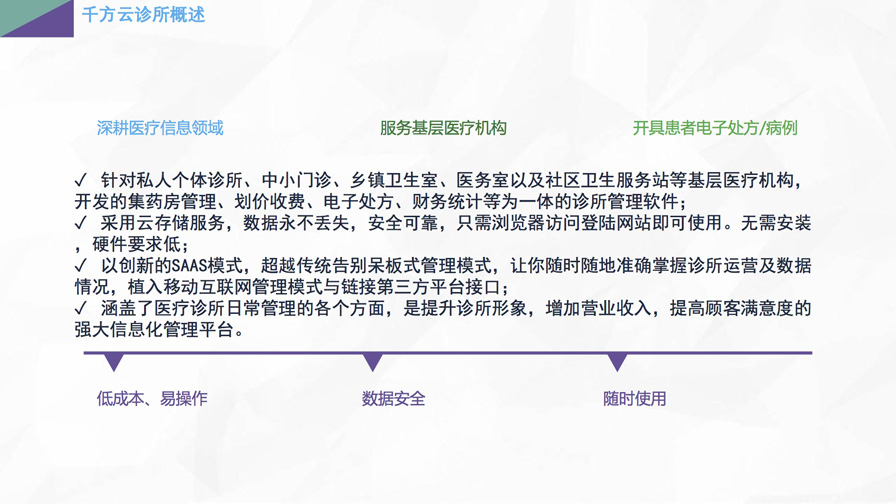 千方云診所是集藥房管理、劃價(jià)收費(fèi)、電子處方、財(cái)務(wù)統(tǒng)計(jì)、中醫(yī)智能診斷等為一體的診所管理軟件。采用云存儲(chǔ)服務(wù),數(shù)據(jù)永不丟失,安全可靠,只需瀏覽器訪問(wèn)登陸網(wǎng)站即可使用。